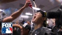 The Los Angeles Dodgers start their champagne celebration after manager, Dave Roberts, delivers a heartfelt speech following their World Series victory.